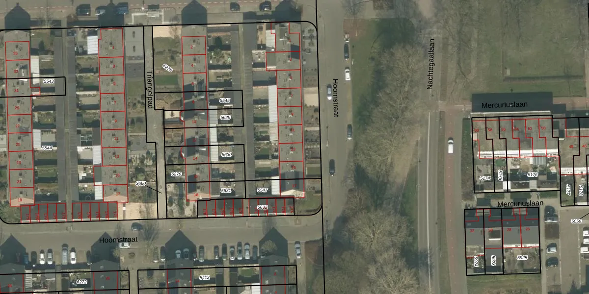 Het perceel waarop Hoornstraat 13 staat heeft een oppervlakte van 2249 m². Dit is een zeer groot perceel. De perceeloppervlakte wordt geregistreerd door het Kadaster. Gedetailleerde informatie over de maten van dit perceel kunt u vinden in het rapport Kadastrale kaart met maatvoering van Hoornstraat 13.