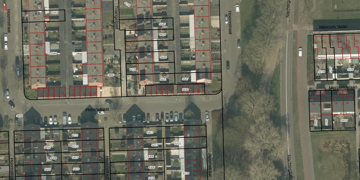Hoornstraat 17-E is gelegen op kadastraal perceel HMD00B5632. Deze kadastrale aanduiding is uniek en wordt gebruikt door het Kadaster om eigendomsrechten en andere zakelijke rechten vast te leggen. Het perceel maakt onderdeel uit van de kadastrale gemeente Helmond.