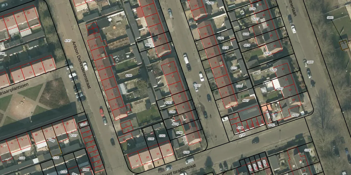 Het perceel waarop Jacob Marisstraat 12 staat heeft een oppervlakte van 4236 m². Dit is een zeer groot perceel. De perceeloppervlakte wordt geregistreerd door het Kadaster. Gedetailleerde informatie over de maten van dit perceel kunt u vinden in het rapport Kadastrale kaart met maatvoering van Jacob Marisstraat 12.