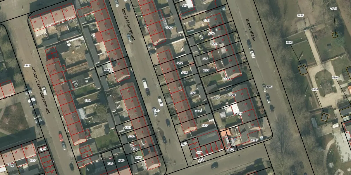 Het perceel waarop Jacob Marisstraat 9 staat heeft een oppervlakte van 410 m². Dit is een groot perceel. De perceeloppervlakte wordt geregistreerd door het Kadaster. Gedetailleerde informatie over de maten van dit perceel kunt u vinden in het rapport Kadastrale kaart met maatvoering van Jacob Marisstraat 9.
