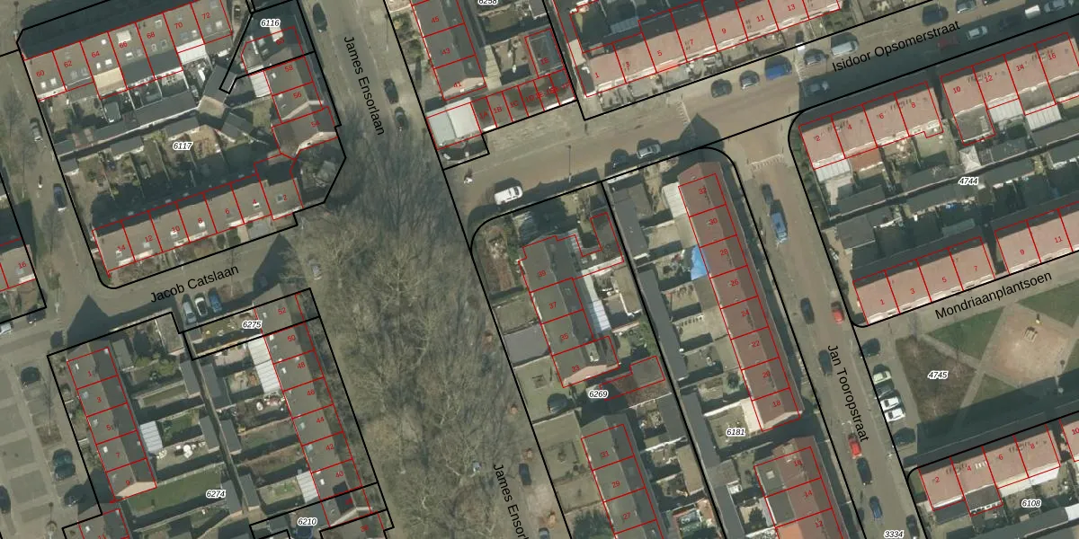 Het perceel waarop James Ensorlaan 39 staat heeft een oppervlakte van 1980 m². Dit is een zeer groot perceel. De perceeloppervlakte wordt geregistreerd door het Kadaster. Gedetailleerde informatie over de maten van dit perceel kunt u vinden in het rapport Kadastrale kaart met maatvoering van James Ensorlaan 39.