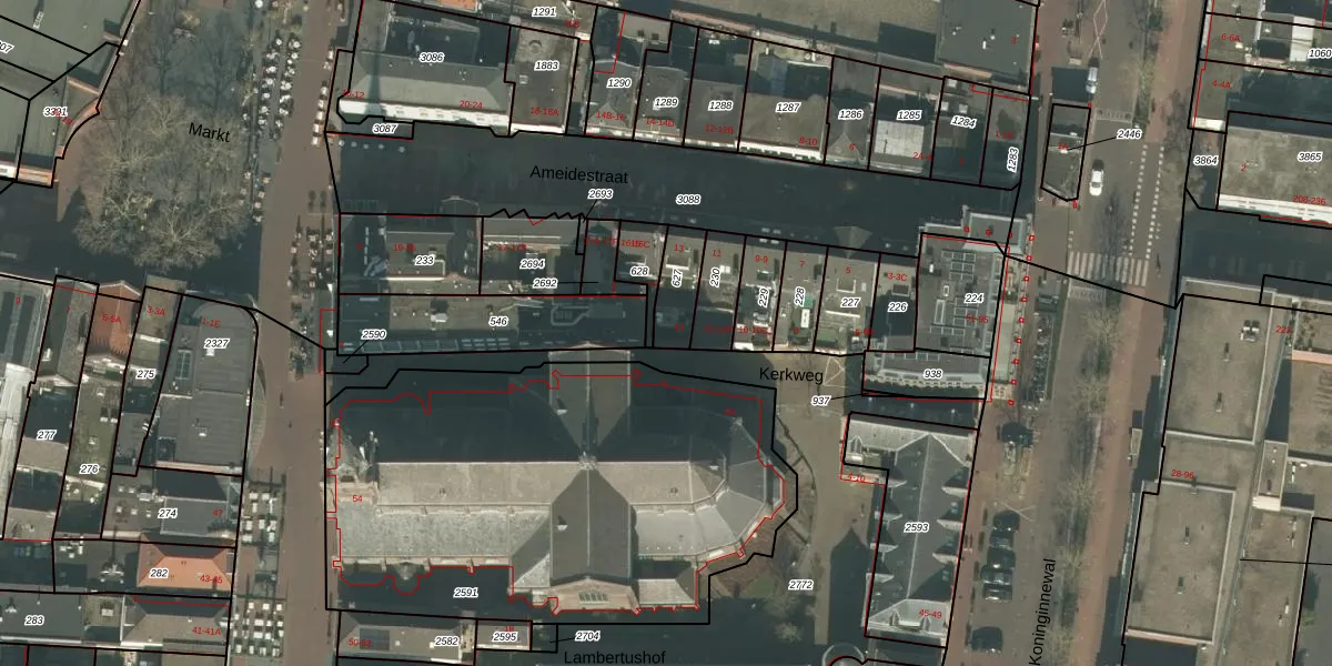 Kerkweg 14 is gelegen op kadastraal perceel HMD00I627. Deze kadastrale aanduiding is uniek en wordt gebruikt door het Kadaster om eigendomsrechten en andere zakelijke rechten vast te leggen. Het perceel maakt onderdeel uit van de kadastrale gemeente Helmond.
