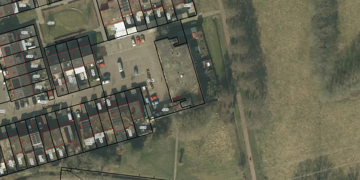 Het perceel waarop Kotterlaan 56 staat heeft een oppervlakte van 633 m². Dit is een groot perceel. De perceeloppervlakte wordt geregistreerd door het Kadaster. Gedetailleerde informatie over de maten van dit perceel kunt u vinden in het rapport Kadastrale kaart met maatvoering van Kotterlaan 56.