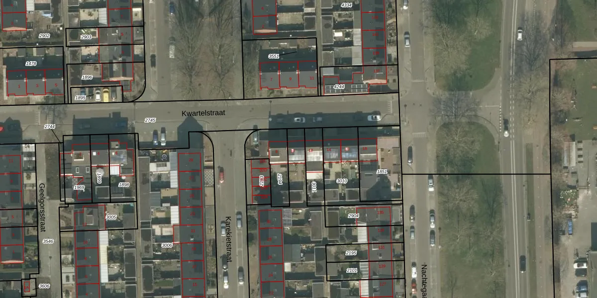 Het perceel waarop Kwartelstraat 10 staat heeft een oppervlakte van 3869 m². Dit is een zeer groot perceel. De perceeloppervlakte wordt geregistreerd door het Kadaster. Gedetailleerde informatie over de maten van dit perceel kunt u vinden in het rapport Kadastrale kaart met maatvoering van Kwartelstraat 10.