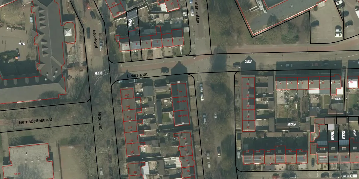 Het perceel waarop Leliestraat 2 staat heeft een oppervlakte van 6551 m². Dit is een zeer groot perceel. De perceeloppervlakte wordt geregistreerd door het Kadaster. Gedetailleerde informatie over de maten van dit perceel kunt u vinden in het rapport Kadastrale kaart met maatvoering van Leliestraat 2.