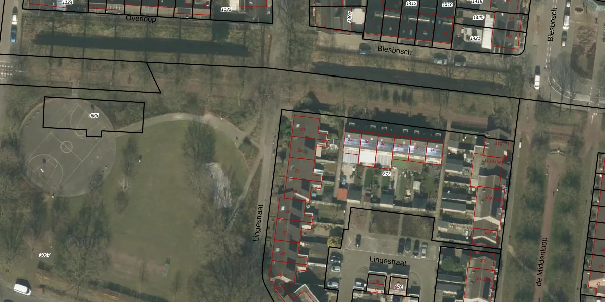 Het perceel waarop Lingestraat 30 staat heeft een oppervlakte van 3477 m². Dit is een zeer groot perceel. De perceeloppervlakte wordt geregistreerd door het Kadaster. Gedetailleerde informatie over de maten van dit perceel kunt u vinden in het rapport Kadastrale kaart met maatvoering van Lingestraat 30.