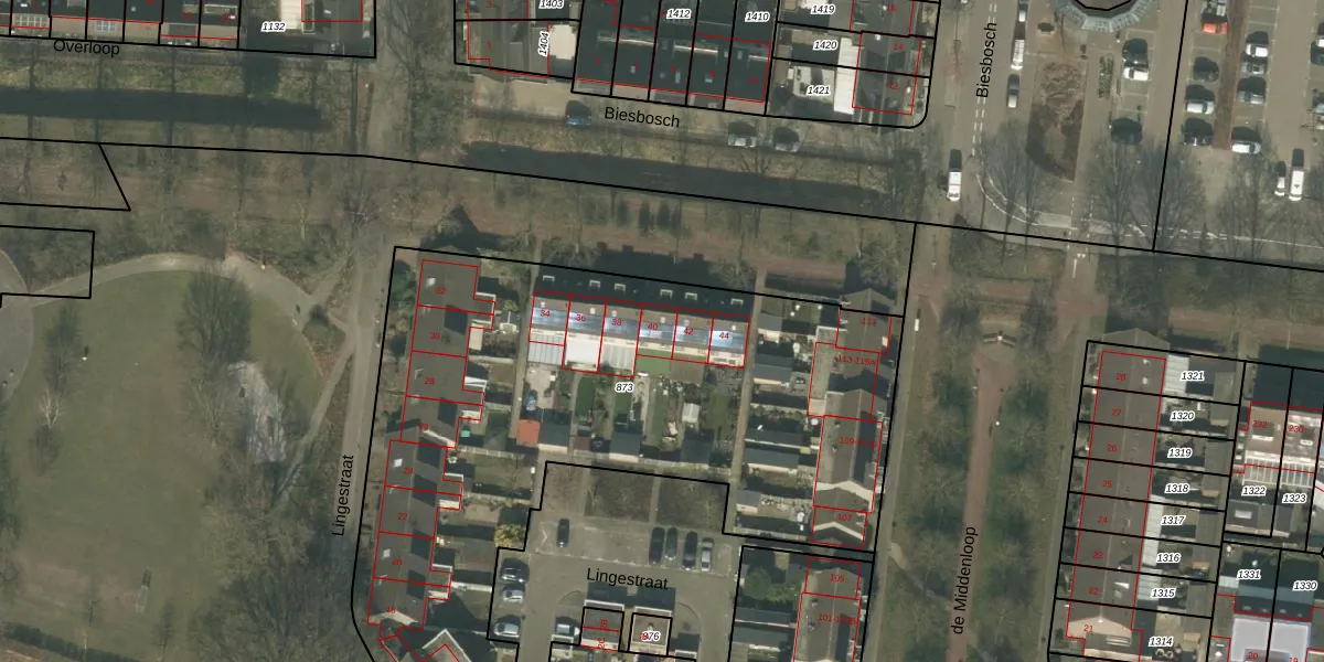 Het perceel waarop Lingestraat 40 staat heeft een oppervlakte van 3477 m². Dit is een zeer groot perceel. De perceeloppervlakte wordt geregistreerd door het Kadaster. Gedetailleerde informatie over de maten van dit perceel kunt u vinden in het rapport Kadastrale kaart met maatvoering van Lingestraat 40.
