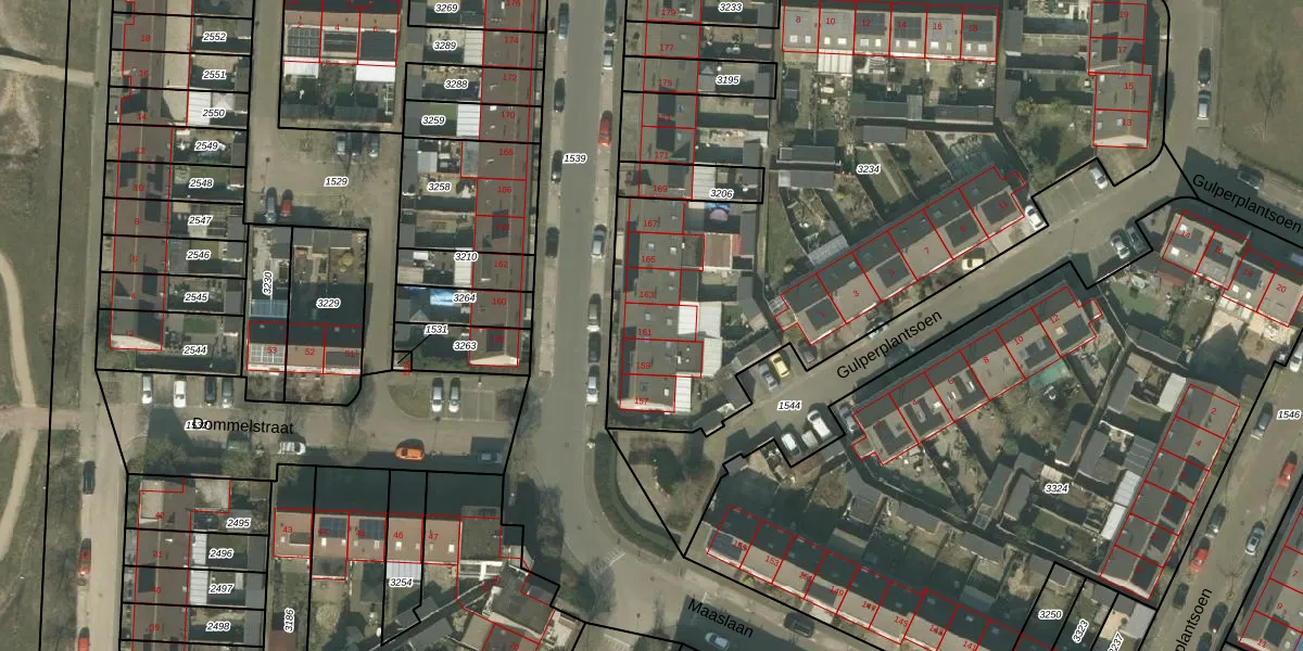 Het perceel waarop Maaslaan 161 staat heeft een oppervlakte van 3734 m². Dit is een zeer groot perceel. De perceeloppervlakte wordt geregistreerd door het Kadaster. Gedetailleerde informatie over de maten van dit perceel kunt u vinden in het rapport Kadastrale kaart met maatvoering van Maaslaan 161.