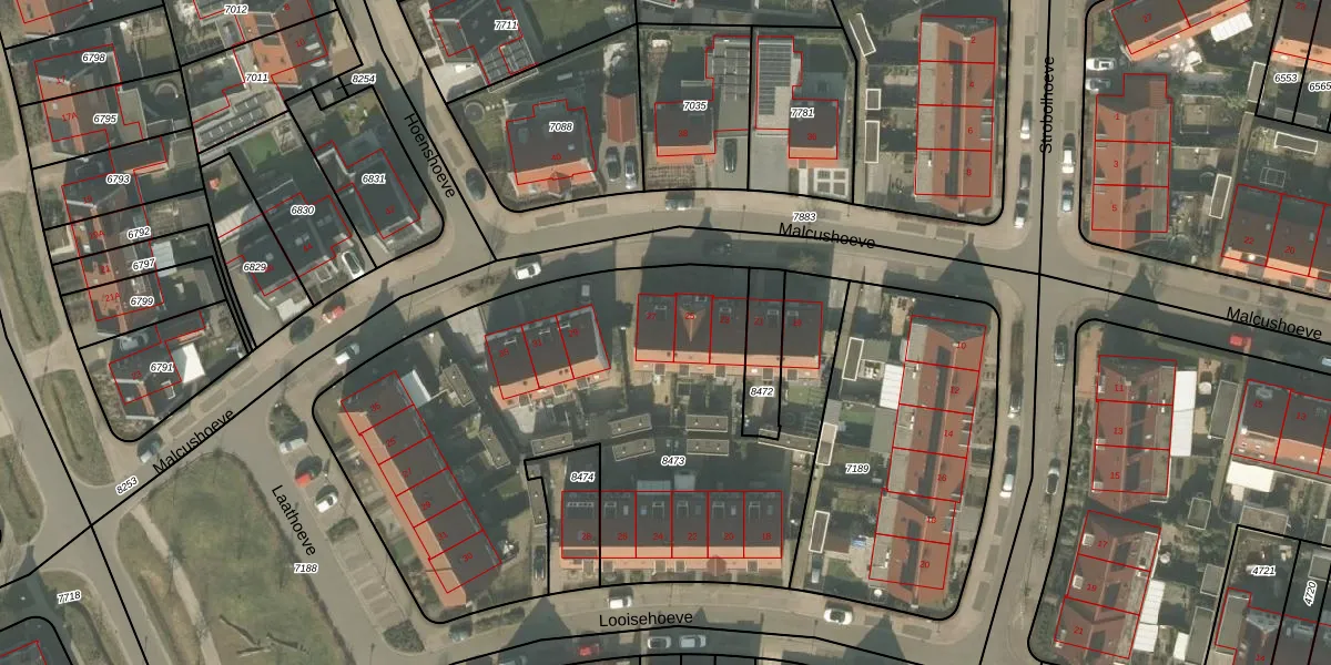 Het perceel waarop Malcushoeve 27 staat heeft een oppervlakte van 2870 m². Dit is een zeer groot perceel. De perceeloppervlakte wordt geregistreerd door het Kadaster. Gedetailleerde informatie over de maten van dit perceel kunt u vinden in het rapport Kadastrale kaart met maatvoering van Malcushoeve 27.