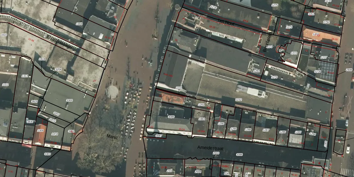 Het perceel waarop Markt 16-C staat heeft een oppervlakte van 1799 m². Dit is een zeer groot perceel. De perceeloppervlakte wordt geregistreerd door het Kadaster. Gedetailleerde informatie over de maten van dit perceel kunt u vinden in het rapport Kadastrale kaart met maatvoering van Markt 16-C.