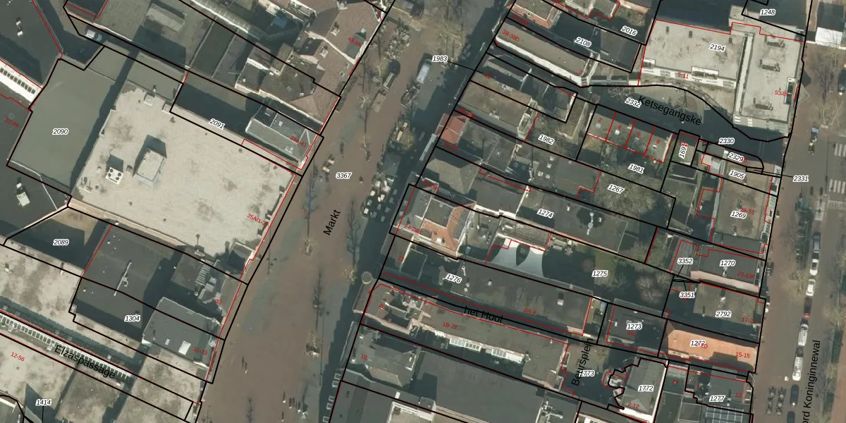 Het perceel waarop Markt 24-C staat heeft een oppervlakte van 805 m². Dit is een groot perceel. De perceeloppervlakte wordt geregistreerd door het Kadaster. Gedetailleerde informatie over de maten van dit perceel kunt u vinden in het rapport Kadastrale kaart met maatvoering van Markt 24-C.