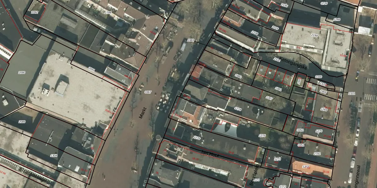 Het perceel waarop Markt 26 staat heeft een oppervlakte van 510 m². Dit is een groot perceel. De perceeloppervlakte wordt geregistreerd door het Kadaster. Gedetailleerde informatie over de maten van dit perceel kunt u vinden in het rapport Kadastrale kaart met maatvoering van Markt 26.