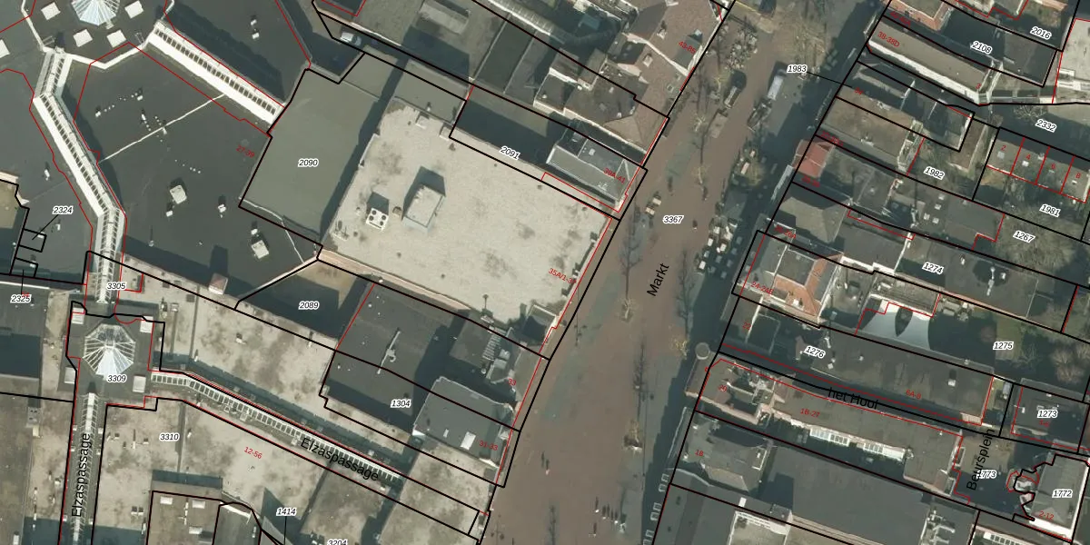 Het perceel waarop Markt 35-B-1 staat heeft een oppervlakte van 2030 m². Dit is een zeer groot perceel. De perceeloppervlakte wordt geregistreerd door het Kadaster. Gedetailleerde informatie over de maten van dit perceel kunt u vinden in het rapport Kadastrale kaart met maatvoering van Markt 35-B-1.