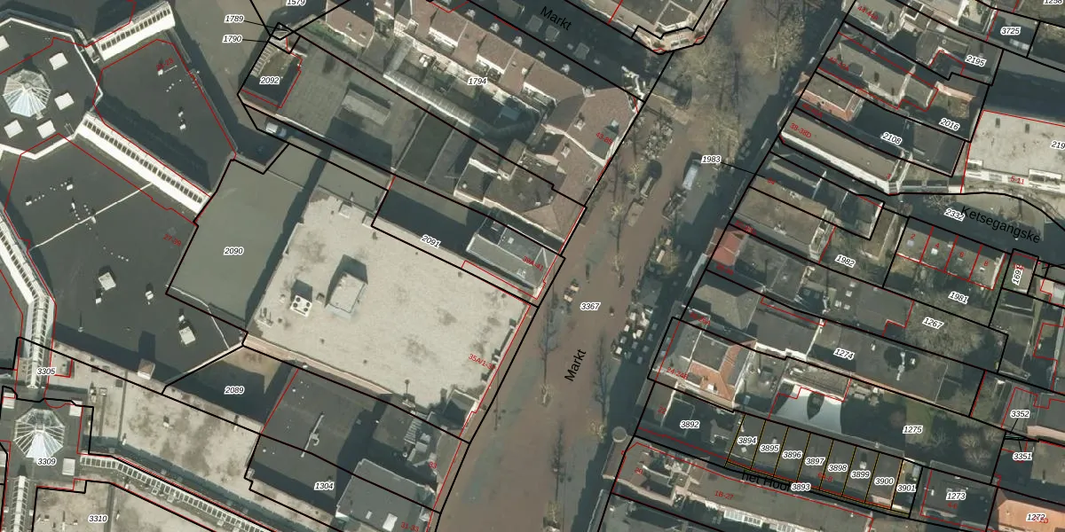 Het perceel waarop Markt 39-B staat heeft een oppervlakte van 474 m². Dit is een groot perceel. De perceeloppervlakte wordt geregistreerd door het Kadaster. Gedetailleerde informatie over de maten van dit perceel kunt u vinden in het rapport Kadastrale kaart met maatvoering van Markt 39-B.