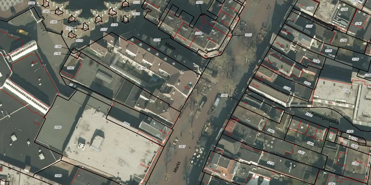 Het perceel waarop Markt 61-B staat heeft een oppervlakte van 1230 m². Dit is een zeer groot perceel. De perceeloppervlakte wordt geregistreerd door het Kadaster. Gedetailleerde informatie over de maten van dit perceel kunt u vinden in het rapport Kadastrale kaart met maatvoering van Markt 61-B.