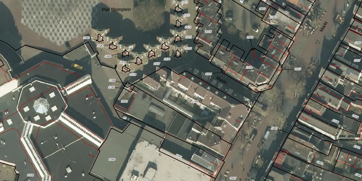 Het perceel waarop Markt 63-A staat heeft een oppervlakte van 1230 m². Dit is een zeer groot perceel. De perceeloppervlakte wordt geregistreerd door het Kadaster. Gedetailleerde informatie over de maten van dit perceel kunt u vinden in het rapport Kadastrale kaart met maatvoering van Markt 63-A.
