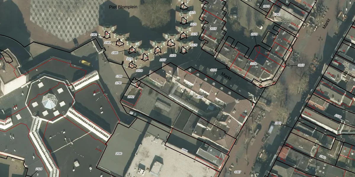 Het perceel waarop Markt 81 staat heeft een oppervlakte van 1230 m². Dit is een zeer groot perceel. De perceeloppervlakte wordt geregistreerd door het Kadaster. Gedetailleerde informatie over de maten van dit perceel kunt u vinden in het rapport Kadastrale kaart met maatvoering van Markt 81.