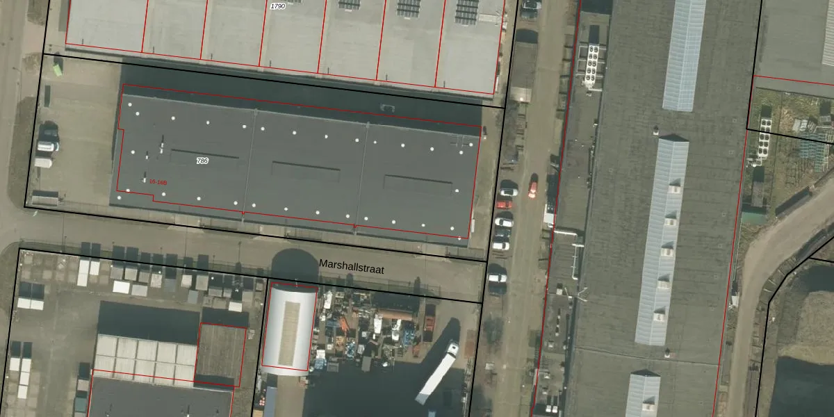 Het perceel waarop Marshallstraat 16-B staat heeft een oppervlakte van 4135 m². Dit is een zeer groot perceel. De perceeloppervlakte wordt geregistreerd door het Kadaster. Gedetailleerde informatie over de maten van dit perceel kunt u vinden in het rapport Kadastrale kaart met maatvoering van Marshallstraat 16-B.