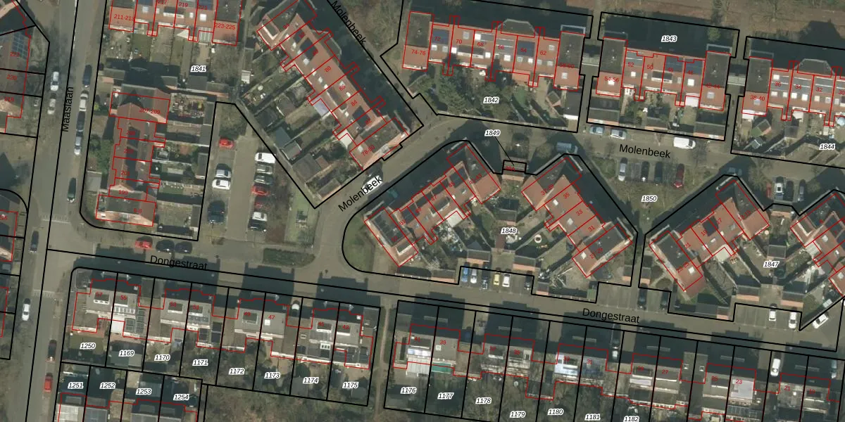 Het perceel waarop Molenbeek 49 staat heeft een oppervlakte van 1729 m². Dit is een zeer groot perceel. De perceeloppervlakte wordt geregistreerd door het Kadaster. Gedetailleerde informatie over de maten van dit perceel kunt u vinden in het rapport Kadastrale kaart met maatvoering van Molenbeek 49.