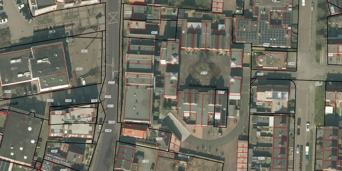Het perceel waarop Notehoutstraat 15 staat heeft een oppervlakte van 5660 m². Dit is een zeer groot perceel. De perceeloppervlakte wordt geregistreerd door het Kadaster. Gedetailleerde informatie over de maten van dit perceel kunt u vinden in het rapport Kadastrale kaart met maatvoering van Notehoutstraat 15.