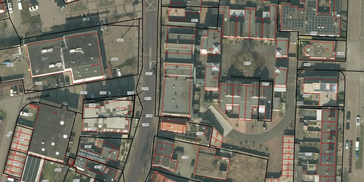 Het perceel waarop Notehoutstraat 22 staat heeft een oppervlakte van 5660 m². Dit is een zeer groot perceel. De perceeloppervlakte wordt geregistreerd door het Kadaster. Gedetailleerde informatie over de maten van dit perceel kunt u vinden in het rapport Kadastrale kaart met maatvoering van Notehoutstraat 22.