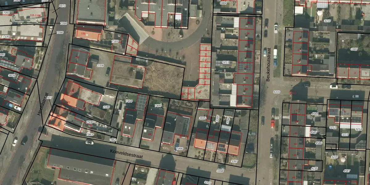 Het perceel waarop Notehoutstraat 34-K staat heeft een oppervlakte van 5660 m². Dit is een zeer groot perceel. De perceeloppervlakte wordt geregistreerd door het Kadaster. Gedetailleerde informatie over de maten van dit perceel kunt u vinden in het rapport Kadastrale kaart met maatvoering van Notehoutstraat 34-K.