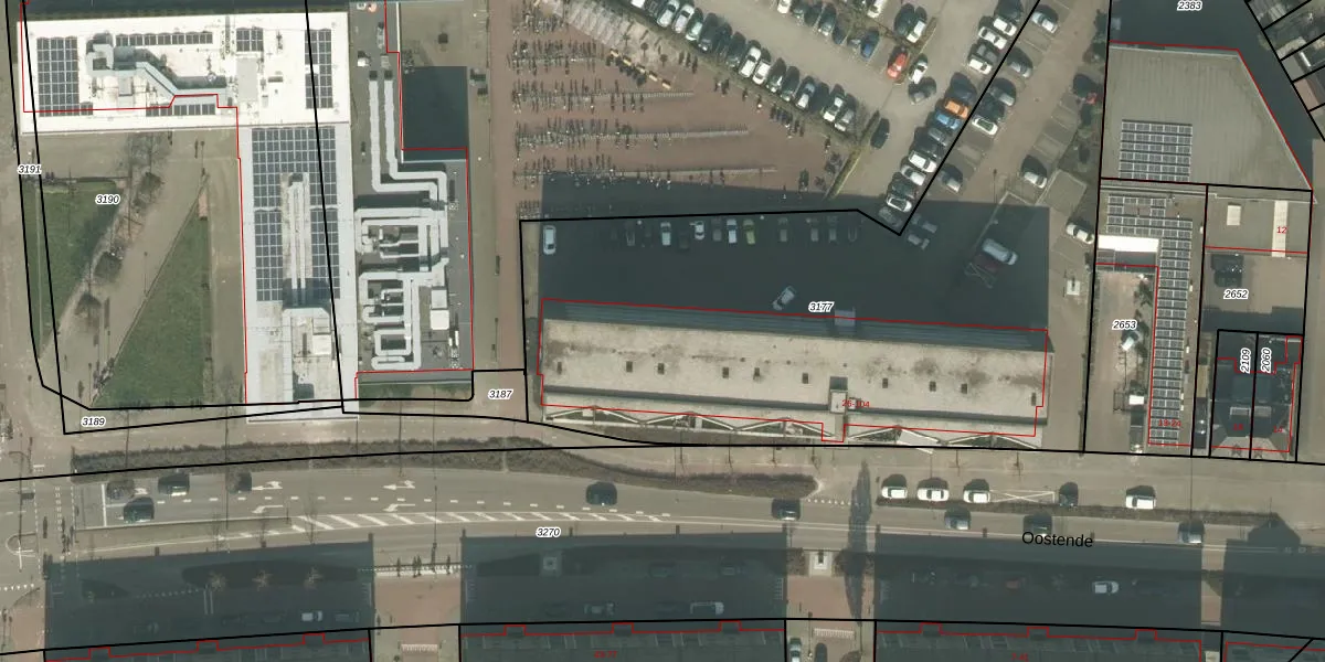 Het perceel waarop Oostende 100 staat heeft een oppervlakte van 3672 m². Dit is een zeer groot perceel. De perceeloppervlakte wordt geregistreerd door het Kadaster. Gedetailleerde informatie over de maten van dit perceel kunt u vinden in het rapport Kadastrale kaart met maatvoering van Oostende 100.