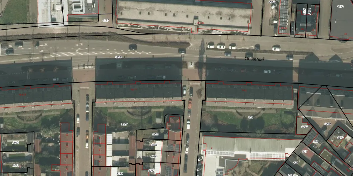Het perceel waarop Oostende 43 staat heeft een oppervlakte van 1813 m². Dit is een zeer groot perceel. De perceeloppervlakte wordt geregistreerd door het Kadaster. Gedetailleerde informatie over de maten van dit perceel kunt u vinden in het rapport Kadastrale kaart met maatvoering van Oostende 43.