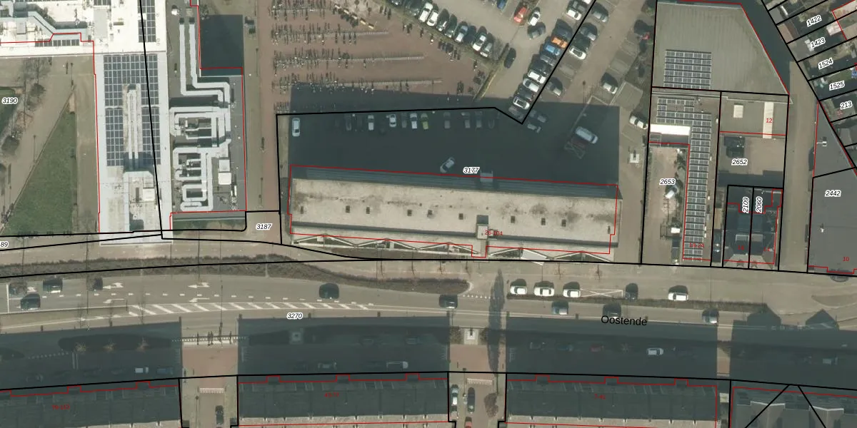 Het perceel waarop Oostende 56 staat heeft een oppervlakte van 3672 m². Dit is een zeer groot perceel. De perceeloppervlakte wordt geregistreerd door het Kadaster. Gedetailleerde informatie over de maten van dit perceel kunt u vinden in het rapport Kadastrale kaart met maatvoering van Oostende 56.