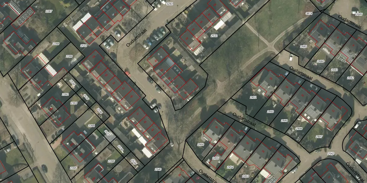 Het perceel waarop Oudartstraat 32 staat heeft een oppervlakte van 2597 m². Dit is een zeer groot perceel. De perceeloppervlakte wordt geregistreerd door het Kadaster. Gedetailleerde informatie over de maten van dit perceel kunt u vinden in het rapport Kadastrale kaart met maatvoering van Oudartstraat 32.