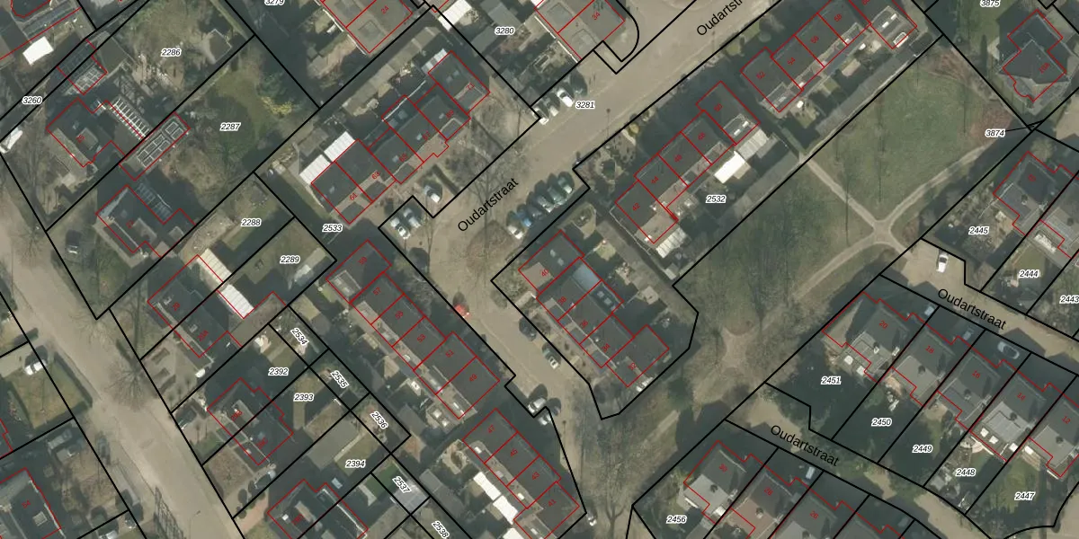 Het perceel waarop Oudartstraat 40 staat heeft een oppervlakte van 2597 m². Dit is een zeer groot perceel. De perceeloppervlakte wordt geregistreerd door het Kadaster. Gedetailleerde informatie over de maten van dit perceel kunt u vinden in het rapport Kadastrale kaart met maatvoering van Oudartstraat 40.