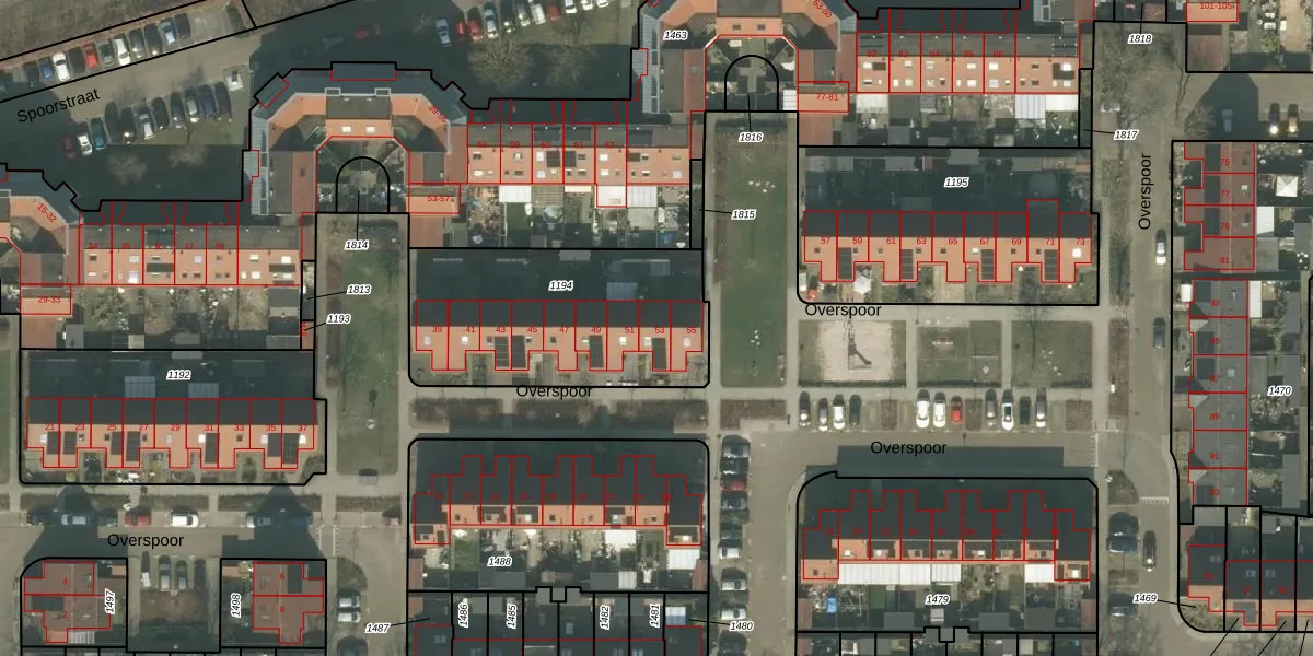 Het perceel waarop Overspoor 53 staat heeft een oppervlakte van 952 m². Dit is een groot perceel. De perceeloppervlakte wordt geregistreerd door het Kadaster. Gedetailleerde informatie over de maten van dit perceel kunt u vinden in het rapport Kadastrale kaart met maatvoering van Overspoor 53.