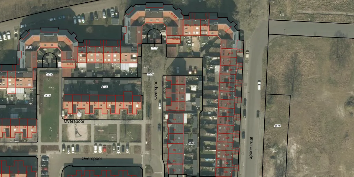 Het perceel waarop Overspoor 77 staat heeft een oppervlakte van 1206 m². Dit is een zeer groot perceel. De perceeloppervlakte wordt geregistreerd door het Kadaster. Gedetailleerde informatie over de maten van dit perceel kunt u vinden in het rapport Kadastrale kaart met maatvoering van Overspoor 77.