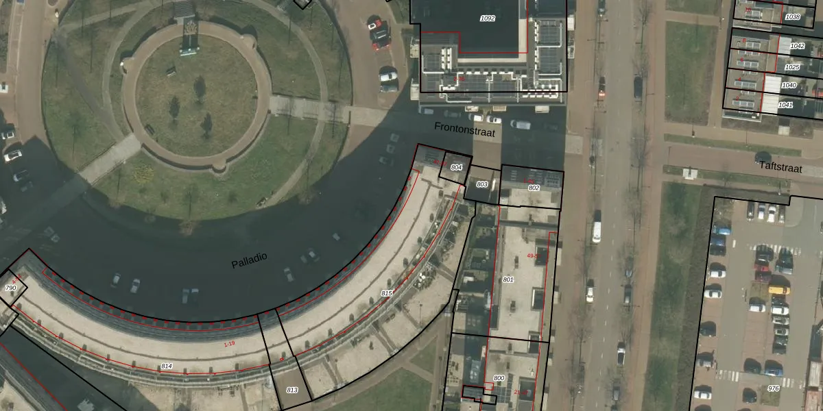 Het perceel waarop Palladio 18 staat heeft een oppervlakte van 1363 m². Dit is een zeer groot perceel. De perceeloppervlakte wordt geregistreerd door het Kadaster. Gedetailleerde informatie over de maten van dit perceel kunt u vinden in het rapport Kadastrale kaart met maatvoering van Palladio 18.