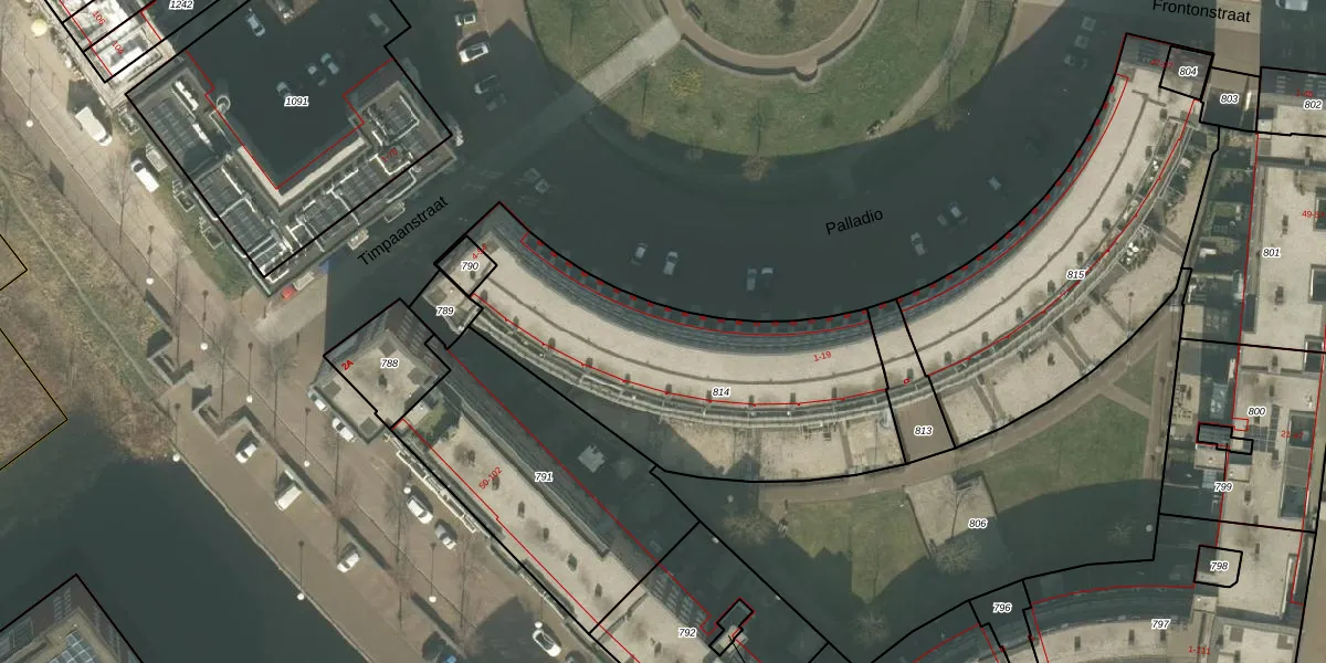 Het perceel waarop Palladio 5 staat heeft een oppervlakte van 1430 m². Dit is een zeer groot perceel. De perceeloppervlakte wordt geregistreerd door het Kadaster. Gedetailleerde informatie over de maten van dit perceel kunt u vinden in het rapport Kadastrale kaart met maatvoering van Palladio 5.