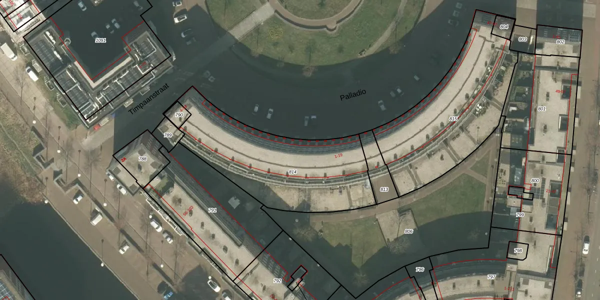 Het perceel waarop Palladio 7 staat heeft een oppervlakte van 1430 m². Dit is een zeer groot perceel. De perceeloppervlakte wordt geregistreerd door het Kadaster. Gedetailleerde informatie over de maten van dit perceel kunt u vinden in het rapport Kadastrale kaart met maatvoering van Palladio 7.
