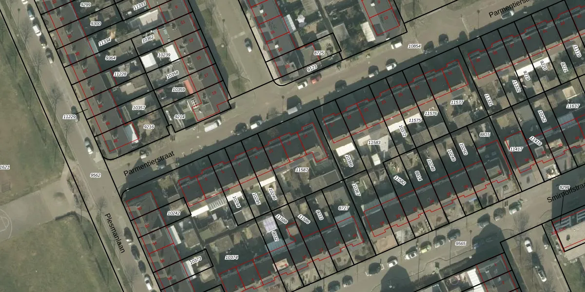 Het perceel waarop Parmentierstraat 13 staat heeft een oppervlakte van 541 m². Dit is een groot perceel. De perceeloppervlakte wordt geregistreerd door het Kadaster. Gedetailleerde informatie over de maten van dit perceel kunt u vinden in het rapport Kadastrale kaart met maatvoering van Parmentierstraat 13.