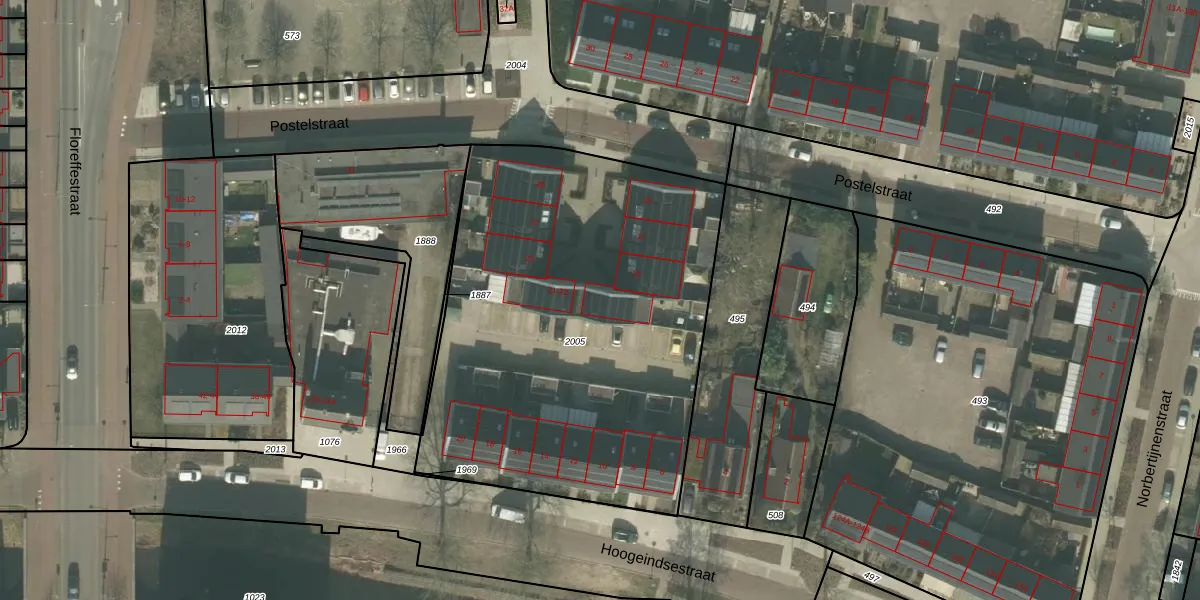 Het perceel waarop Postelstraat 21 staat heeft een oppervlakte van 2443 m². Dit is een zeer groot perceel. De perceeloppervlakte wordt geregistreerd door het Kadaster. Gedetailleerde informatie over de maten van dit perceel kunt u vinden in het rapport Kadastrale kaart met maatvoering van Postelstraat 21.