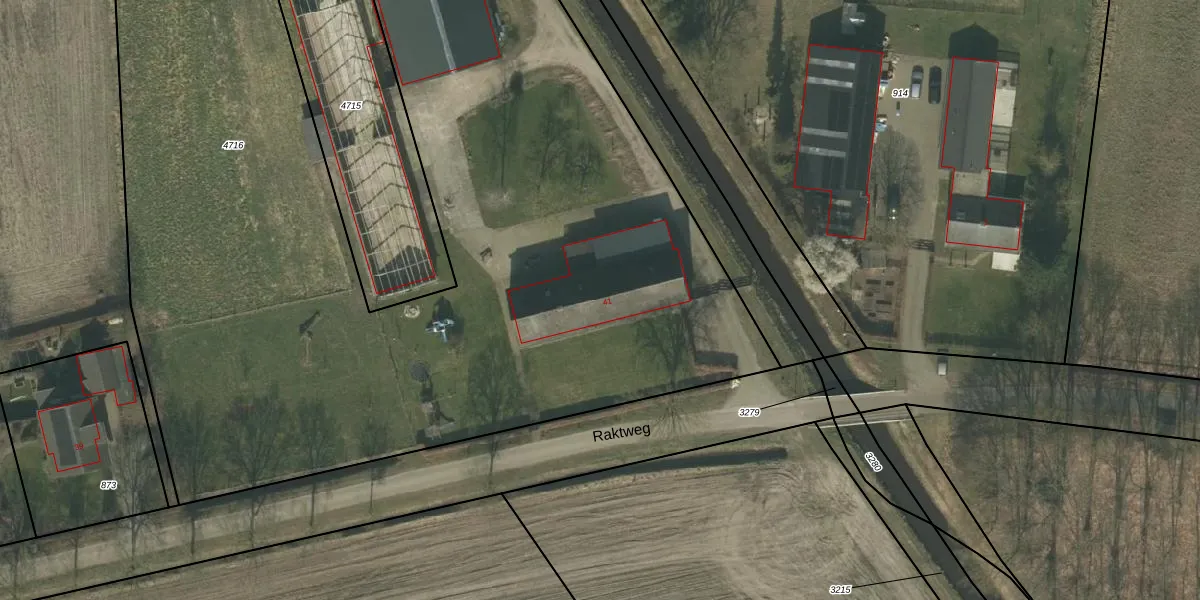 Het perceel waarop Raktweg 41 staat heeft een oppervlakte van 1,0 ha. Dit is een zeer groot perceel. De perceeloppervlakte wordt geregistreerd door het Kadaster. Gedetailleerde informatie over de maten van dit perceel kunt u vinden in het rapport Kadastrale kaart met maatvoering van Raktweg 41.