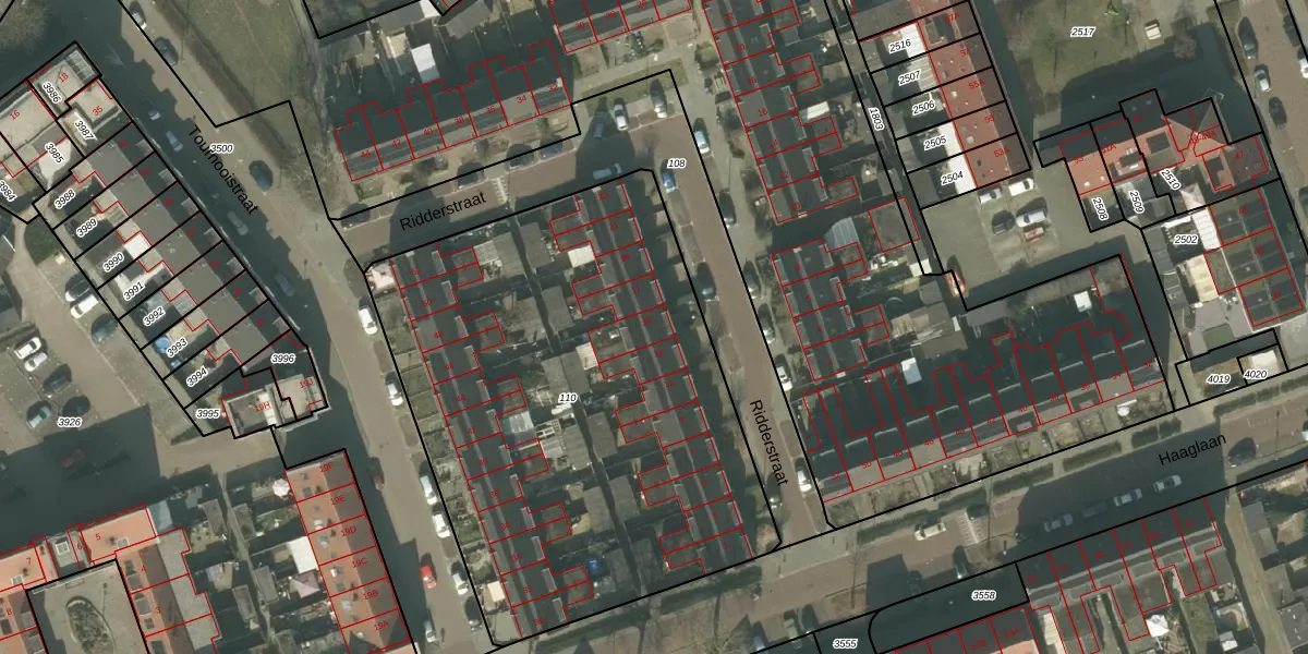Het perceel waarop Ridderstraat 15 staat heeft een oppervlakte van 2867 m². Dit is een zeer groot perceel. De perceeloppervlakte wordt geregistreerd door het Kadaster. Gedetailleerde informatie over de maten van dit perceel kunt u vinden in het rapport Kadastrale kaart met maatvoering van Ridderstraat 15.