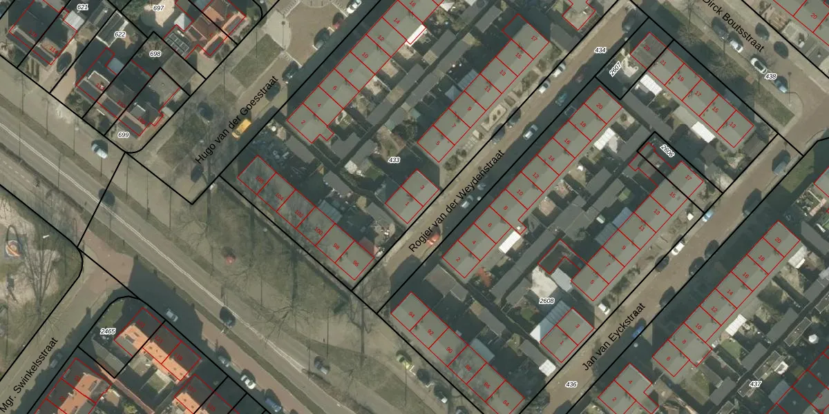 Rogier van der Weydenstraat 1 is gelegen op kadastraal perceel HMD00E433. Deze kadastrale aanduiding is uniek en wordt gebruikt door het Kadaster om eigendomsrechten en andere zakelijke rechten vast te leggen. Het perceel maakt onderdeel uit van de kadastrale gemeente Helmond.