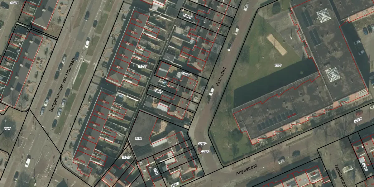 Het perceel waarop Rozenhof 7 staat heeft een oppervlakte van 4954 m². Dit is een zeer groot perceel. De perceeloppervlakte wordt geregistreerd door het Kadaster. Gedetailleerde informatie over de maten van dit perceel kunt u vinden in het rapport Kadastrale kaart met maatvoering van Rozenhof 7.