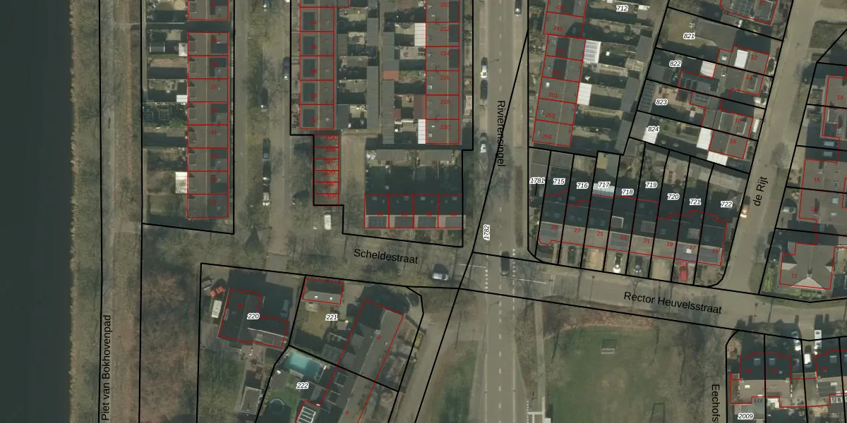 Het perceel waarop Scheldestraat 38 staat heeft een oppervlakte van 6135 m². Dit is een zeer groot perceel. De perceeloppervlakte wordt geregistreerd door het Kadaster. Gedetailleerde informatie over de maten van dit perceel kunt u vinden in het rapport Kadastrale kaart met maatvoering van Scheldestraat 38.