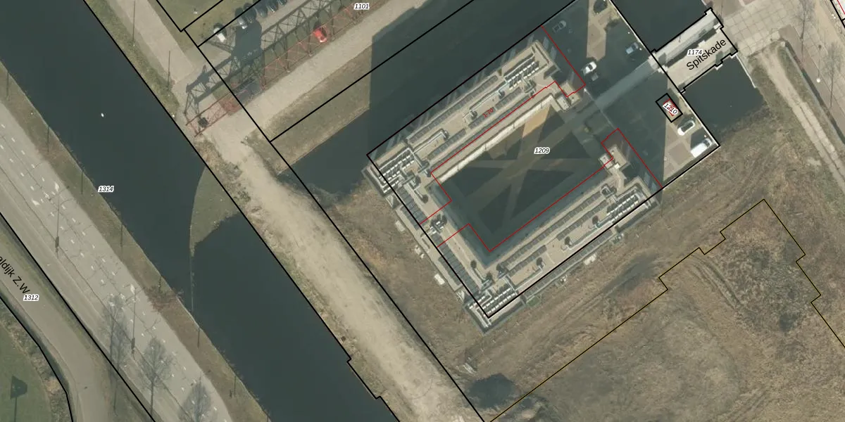 Het perceel waarop Spitskade 23 staat heeft een oppervlakte van 3270 m². Dit is een zeer groot perceel. De perceeloppervlakte wordt geregistreerd door het Kadaster. Gedetailleerde informatie over de maten van dit perceel kunt u vinden in het rapport Kadastrale kaart met maatvoering van Spitskade 23.