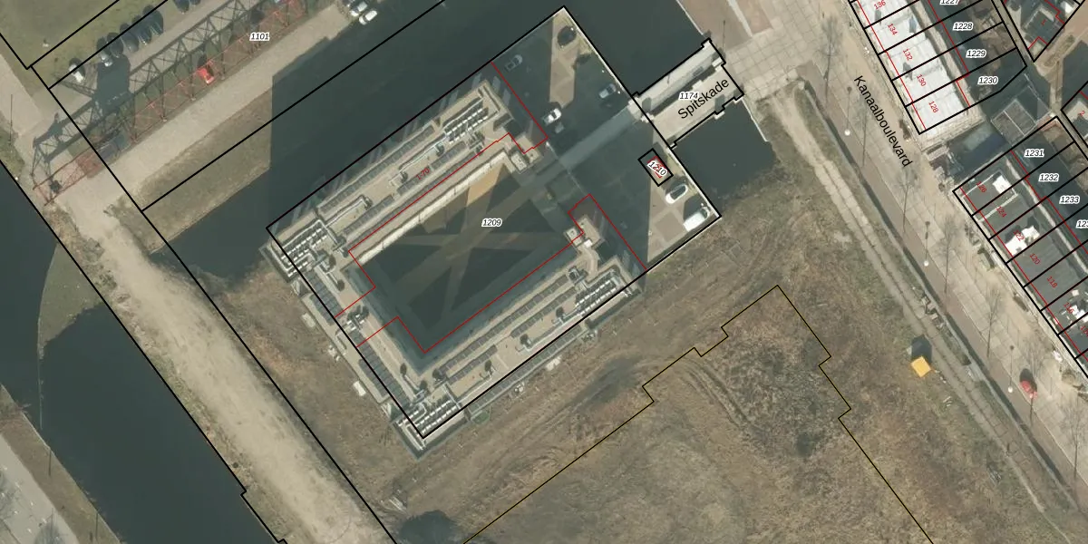 Het perceel waarop Spitskade 43 staat heeft een oppervlakte van 3270 m². Dit is een zeer groot perceel. De perceeloppervlakte wordt geregistreerd door het Kadaster. Gedetailleerde informatie over de maten van dit perceel kunt u vinden in het rapport Kadastrale kaart met maatvoering van Spitskade 43.