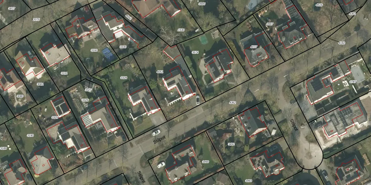 Het perceel waarop Stilpot 21 staat heeft een oppervlakte van 945 m². Dit is een groot perceel. De perceeloppervlakte wordt geregistreerd door het Kadaster. Gedetailleerde informatie over de maten van dit perceel kunt u vinden in het rapport Kadastrale kaart met maatvoering van Stilpot 21.