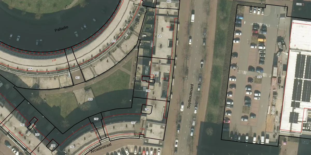 Het perceel waarop het adres ligt is HMD00-F-800. De afkorting 'HMD00' staat voor kadastrale gemeente Helmond. Het perceel is kleiner dan gemiddeld in Helmond. Het perceel is 620 m² groot, terwijl het gemiddelde ligt op 1471,11 m². De grootste perceeloppervlakte in de kadastrale gemeente is 1,14 km². De kleinste oppervlakte bedraagt 0 m². Er zijn 14 adressen aanwezig op het perceel. In de Basisregistratie Kadaster (BRK) werden de grenzen van het perceel geregistreerd op 29-03-2012.