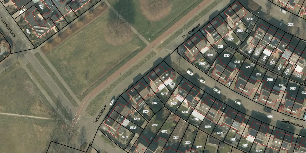Topaasstraat 12 is gelegen op kadastraal perceel HMD00T7018. Deze kadastrale aanduiding is uniek en wordt gebruikt door het Kadaster om eigendomsrechten en andere zakelijke rechten vast te leggen. Het perceel maakt onderdeel uit van de kadastrale gemeente Helmond.