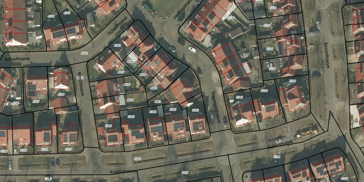 Het perceel waarop Troymanshoeve 24 staat heeft een oppervlakte van 308 m². Dit is een groot perceel. De perceeloppervlakte wordt geregistreerd door het Kadaster. Gedetailleerde informatie over de maten van dit perceel kunt u vinden in het rapport Kadastrale kaart met maatvoering van Troymanshoeve 24.