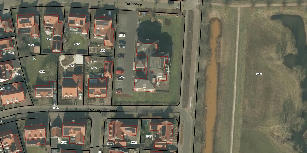 Het perceel waarop Turfhoeve 24 staat heeft een oppervlakte van 2725 m². Dit is een zeer groot perceel. De perceeloppervlakte wordt geregistreerd door het Kadaster. Gedetailleerde informatie over de maten van dit perceel kunt u vinden in het rapport Kadastrale kaart met maatvoering van Turfhoeve 24.